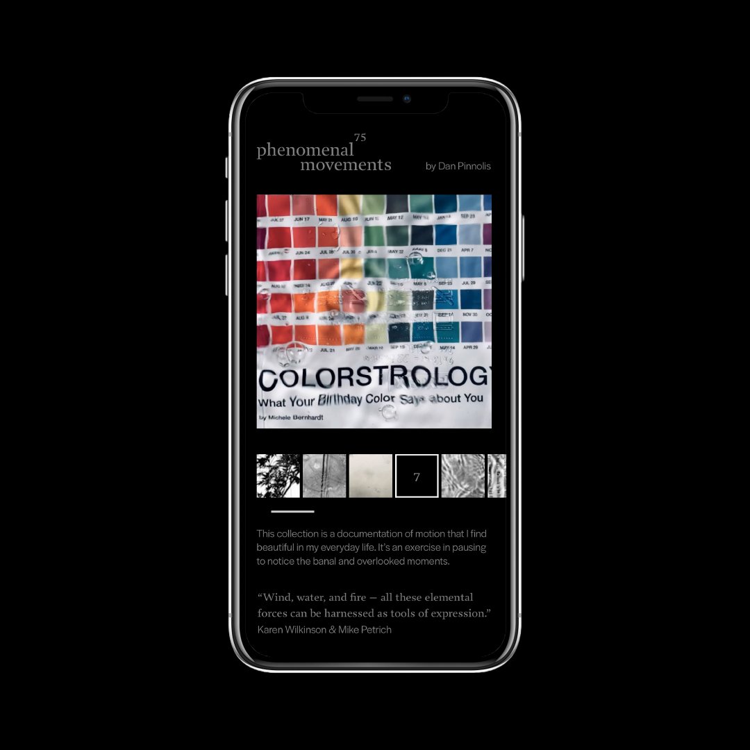 This interactive website is a collection of motion that I find beautiful in my everyday life. It’s an exercise in pausing to notice the banal and overlooked moments. Along with designing the interface, I also did all the front-end development using HTML, CSS, and a little Javascript.